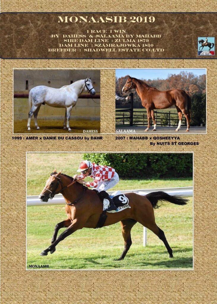 Monaasib este un Pur Sânge Arab de 3 ani născut în Anglia la Shadwell Arabians din Dahess și Salaama. A intrat în proprietatea Junior Speed în toamna anului trecut.